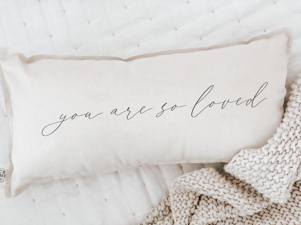 Lumbar Pillow- You Are So Loved - Uplifting, Meaningful, 100% Organic Cotton, Lettered Home Décor, Housewarming gift, Cushion Cover