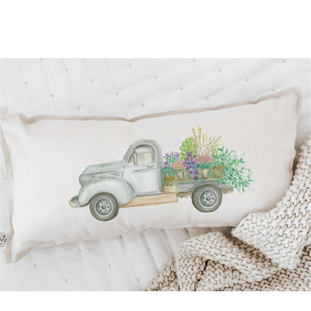 Flower Truck Lumbar Pillow: Watercolor Spring Decor, Handmade Organic Cotton