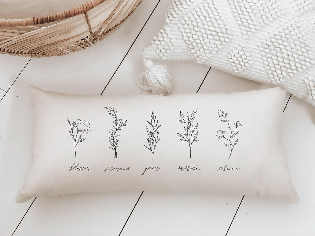 Lumbar Pillow - Wildflowers - Floral Print, Handmade in USA, Organic Cotton, Calligraphy Decor, Shop Small, Housewarming gift, Spring Gifts