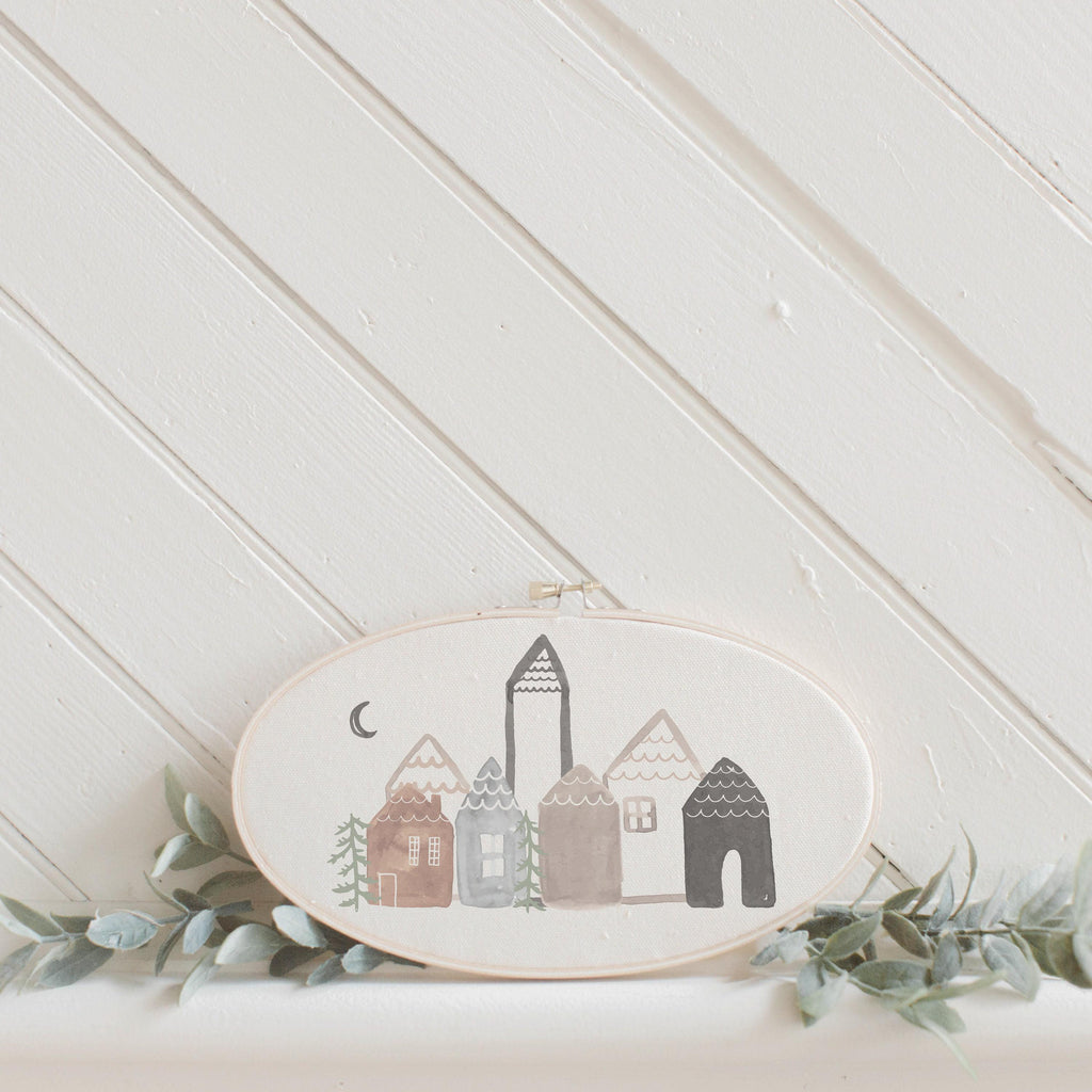 KV x PCB - Winter Houses Oval Printed Embroidery Hoop - Easter gift, housewarming, home decor, spring gift, wall decor, rustic