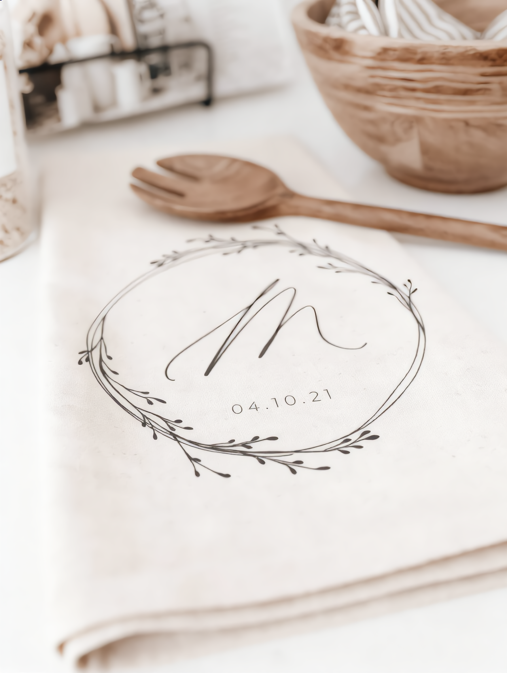 Kitchen Towel - Personalized Wreath Last Name Initial and Date - Made in the USA, housewarming gift, wedding favor, kitchen decor