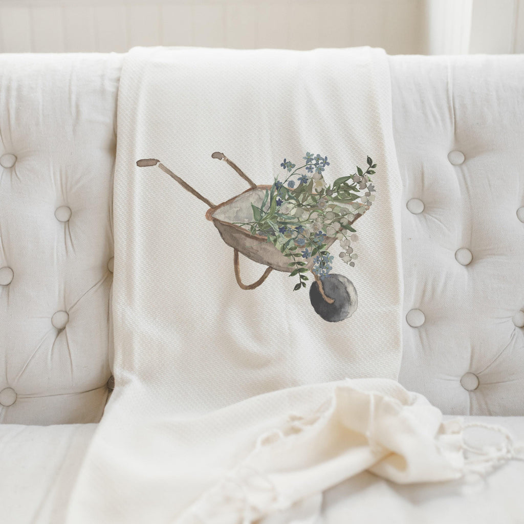 Throw Blanket - Wheel Barrow Watercolor, Lightweight Spring Summer Decor, Made in USA, Living Room, Present, Gift, Spring Decor