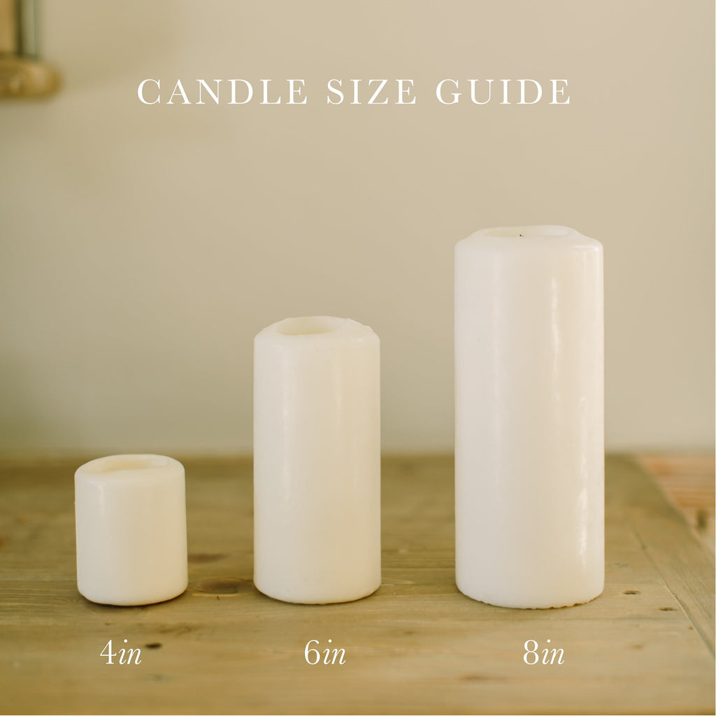 Choose your size! Use the drop down menu when checking out to choose your favorite size. The last picture in the listing is a size comparison for the 3 size variations we offer. Details for the pillar candle sizes are as follows: