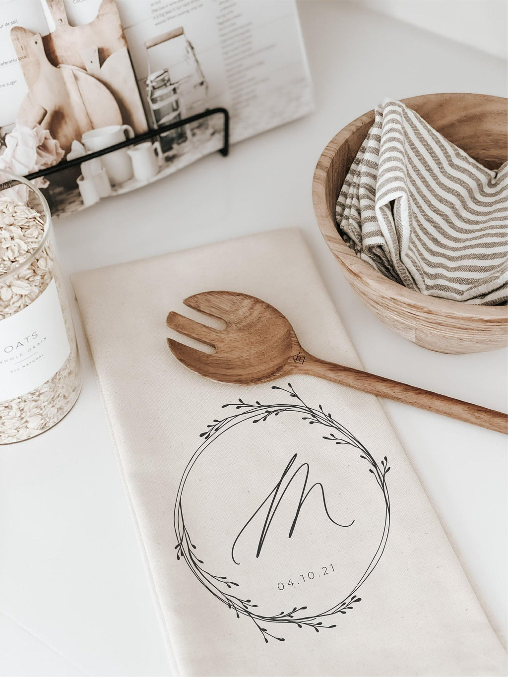 Kitchen Towel - Personalized Wreath Last Name Initial and Date - Made in the USA, housewarming gift, wedding favor, kitchen decor